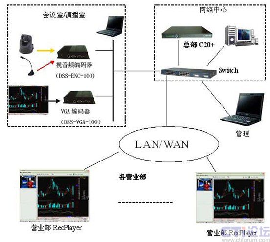 在分析了華安證券的實際需求和網(wǎng)絡環(huán)境以后,決定采用一套DSS-R-C20+來組建整個流媒體系統(tǒng)。系統(tǒng)由媒體采集系統(tǒng)視音頻編碼器(DSS-ENC-100)/VGA編碼器(DSS-ENC-100),流媒體處理和錄制系統(tǒng)(C20+)和客戶端RecPlayer組成。通過此系統(tǒng)可以實現(xiàn)語音、視頻和計算機桌面的同步實時直播、錄制和點播。系統(tǒng)的結構圖如下: