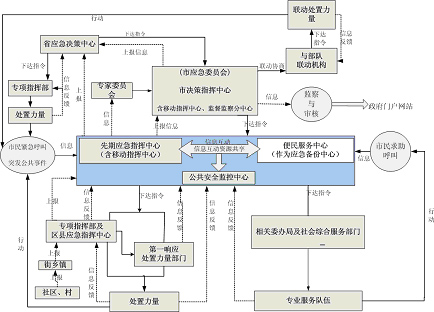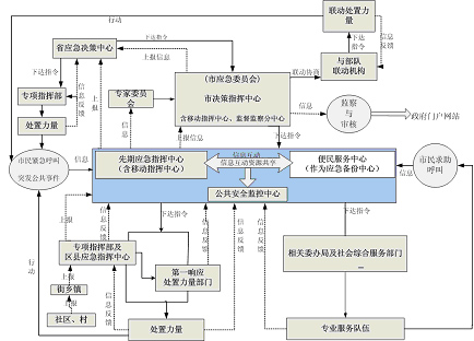 指政府決策指揮中心、先期指揮中心、便民服務(wù)中心、公共安全監(jiān)控中心,通常還有移動指揮中心和災(zāi)備中心,以及其它節(jié)點的建設(shè)。一般地,先期指揮中心與便民服務(wù)中心可互為備份。政府決策指揮中心對重大、特別重大突發(fā)公共事件進(jìn)行協(xié)調(diào)、決策,偏重于自然災(zāi)害與生產(chǎn)安全方面,而一般、較重突發(fā)公共事件仍保持由各專業(yè)指揮部指揮、處置,只有當(dāng)跨區(qū)、跨機構(gòu)需要協(xié)調(diào)時由政府決策指揮中心進(jìn)行協(xié)調(diào)。