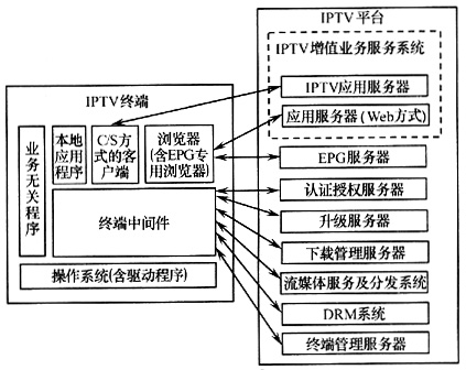 IPTV中間件是當(dāng)前IPTV業(yè)界關(guān)注的熱點(diǎn)之一。業(yè)界對于中間件沒有確切的定義,一般認(rèn)為:中間件是實(shí)現(xiàn)異構(gòu)軟件實(shí)體間互連互通的一類軟件,則IPTV中間件就是實(shí)現(xiàn)IPTV系統(tǒng)中各個節(jié)點(diǎn)之間互連互通的一類軟件。IPTV系統(tǒng)中的節(jié)點(diǎn)類型眾多,包括終端、EPG(電子節(jié)目指南)服務(wù)器、內(nèi)容分發(fā)系統(tǒng)、業(yè)務(wù)管理系統(tǒng)、網(wǎng)管監(jiān)控系統(tǒng)、DRM(數(shù)字版權(quán)管理)、內(nèi)容管理系統(tǒng)、頭端系統(tǒng)等,除終端外,其他節(jié)點(diǎn)都可以統(tǒng)稱為平臺側(cè),因此IPTV中間件也可以分為平臺中間件和終端中間件兩類。平臺中間件實(shí)現(xiàn)系統(tǒng)平臺中各個應(yīng)用服務(wù)器之間的互連互通,終端中間件實(shí)現(xiàn)IPTV終端和系統(tǒng)平臺之間的互連互通。